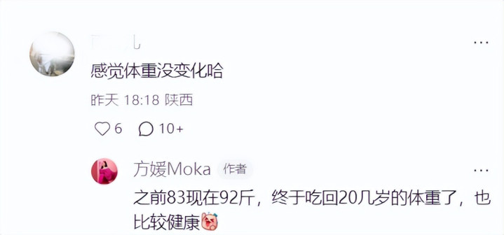 方媛还调侃终于把自己吃回到了自己20几岁的体重了。以方媛的身高,92斤其实是非常健康的了。
